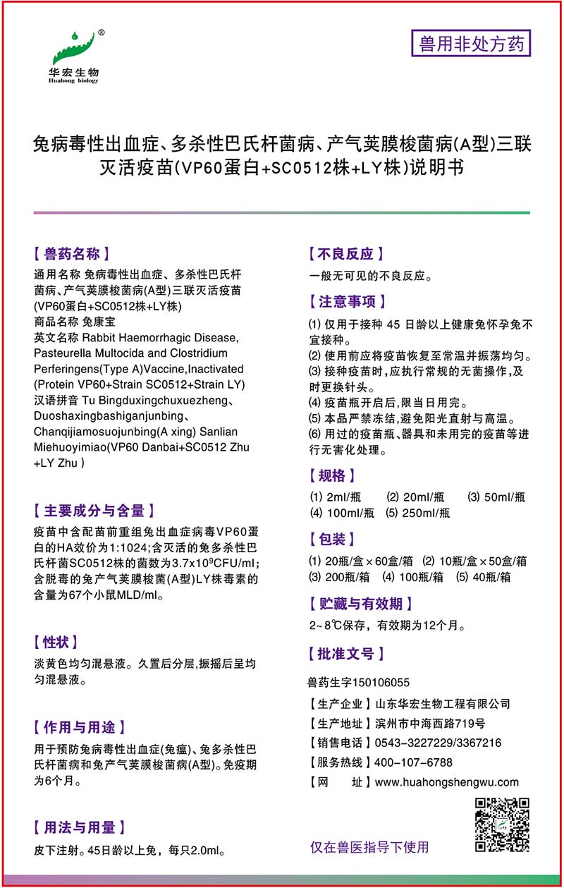 兔病毒性出血癥、多殺性巴氏桿菌病、產氣莢膜梭菌?。ˋ型)三聯滅活疫苗